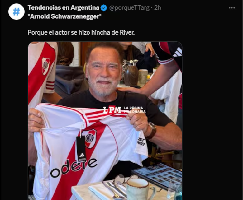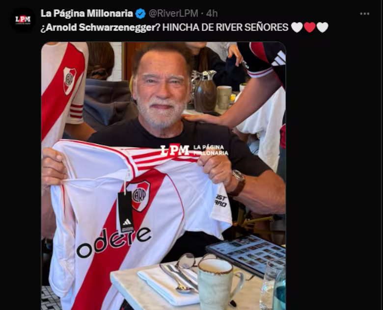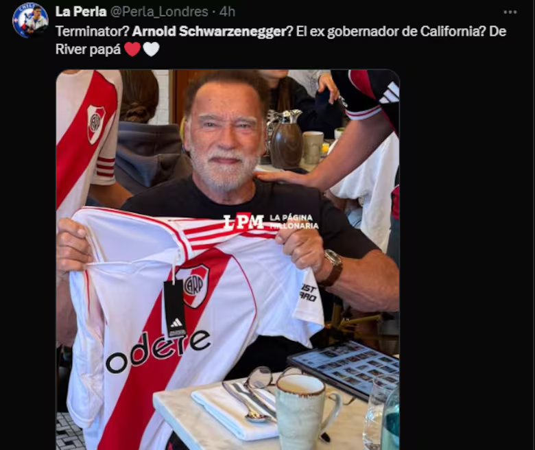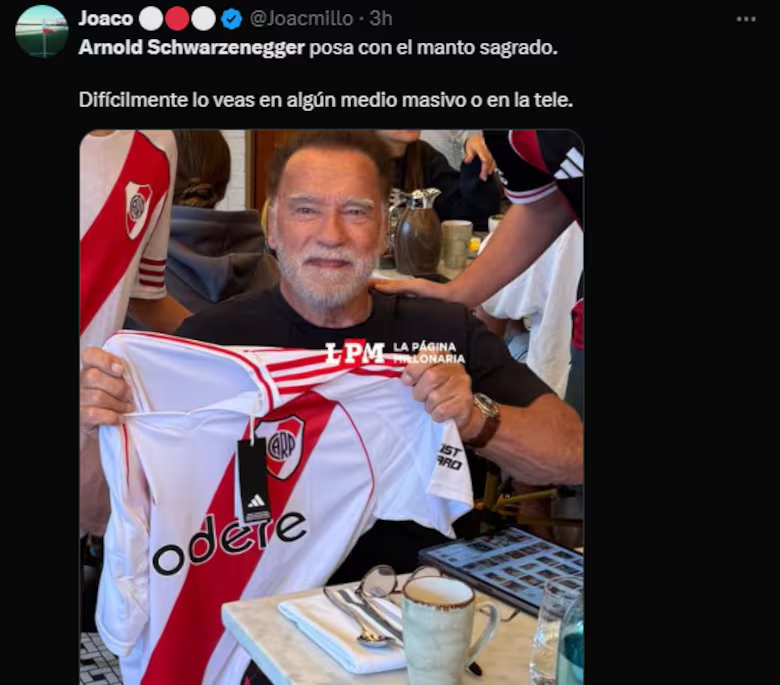 Ahoras de que River Plate se enfrente a Monterrey por el Mundial de Clubes FIFA, se viralizó en la red social X una foto de Arnold Schwarzenegger con la camiseta del equipo Millonario. La prenda le habría llegado al actor por fanáticos del equipo de Núñez, quienes se lo encontraron en un restaurante y, muy contenta, la estrella de cine aceptó a posar con ella.