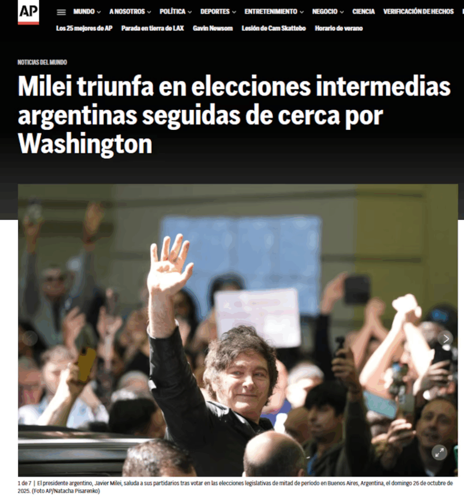 Associated Press publicó un artículo con el siguiente título:“Milei triunfa en elecciones intermedias argentinas seguidas de cerca por Washington”. La agencia de prensa subrayó que los comicios fueron observados por Estados Unidos y otros países debido al impacto económico y geopolítico del resultado, y citó a Milei afirmando que “el pueblo argentino dejó atrás la decadencia y eligió el progreso”.