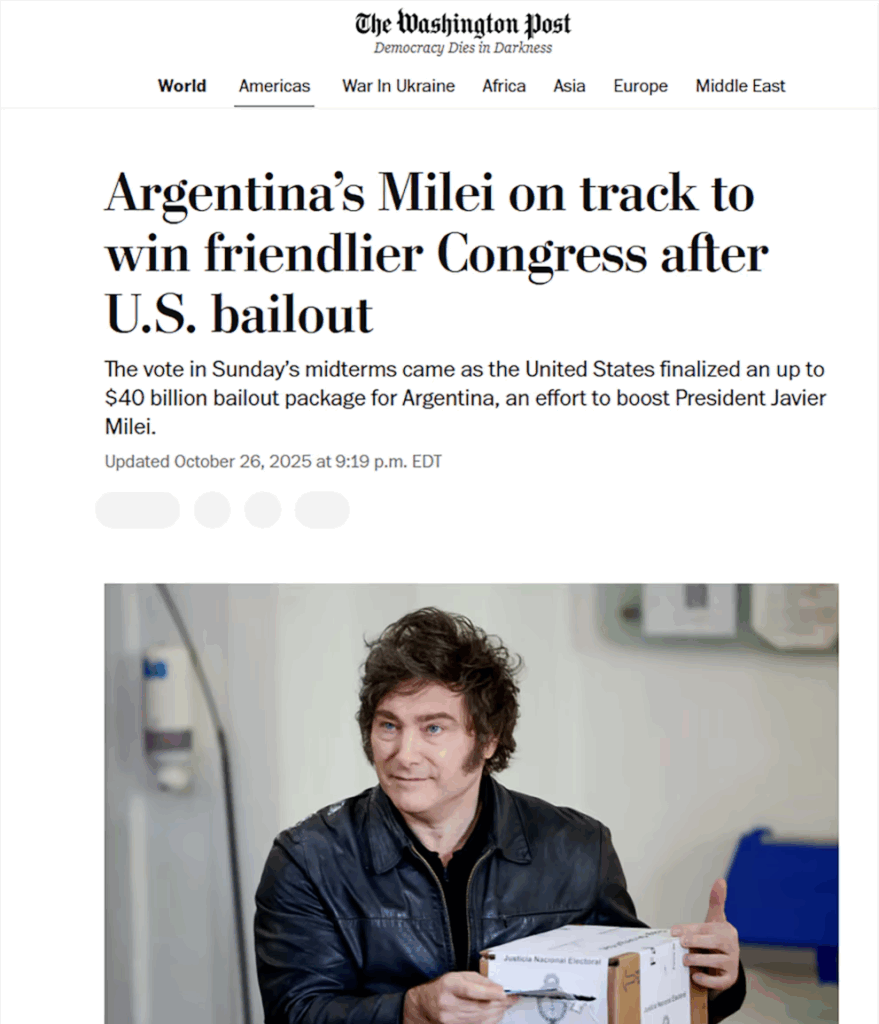 The Washington Post publicó “El argentino Milei se encamina a un Congreso más amigable tras el rescate estadounidense”, señalando que el resultado representa una prueba clave para la administración Milei ante sus socios internacionales, en particular Estados Unidos.