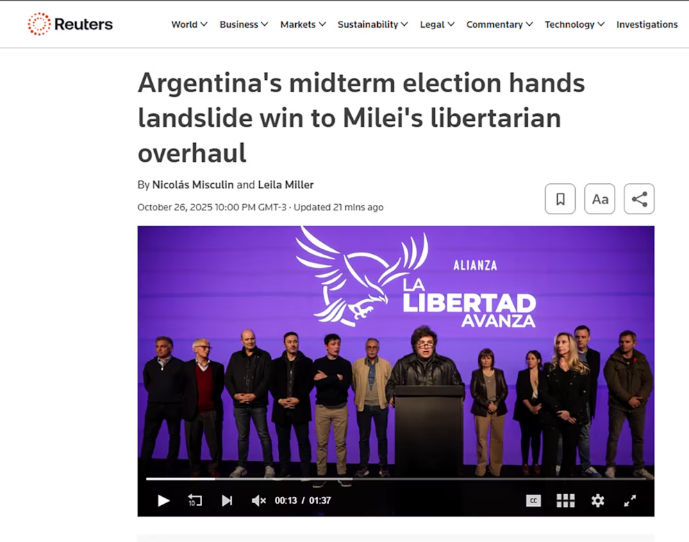 Reuters publicó “Las elecciones legislativas argentinas dan una victoria decisiva a la reforma libertaria de Milei”, donde se subraya que el triunfo habilita al mandatario para consolidar su propuesta de libre mercado.