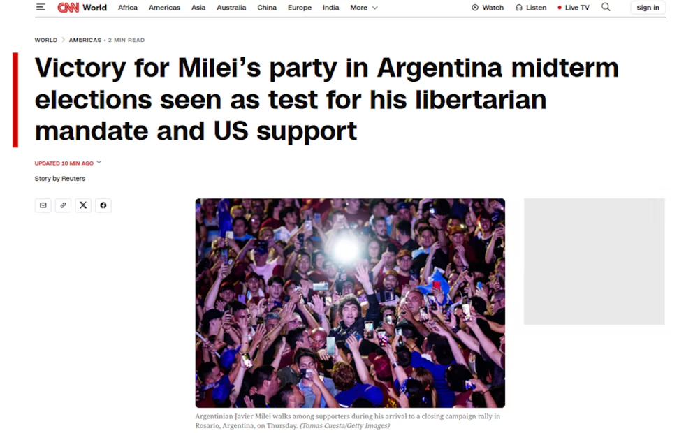 CNN publicó un artículo con el siguiente título: “La victoria del partido de Milei en las elecciones legislativas argentinas se considera una prueba para su mandato libertario y el apoyo de EEUU”, que examina cómo el éxito presidencial repercute en la política latinoamericana y en las relaciones exteriores del país.