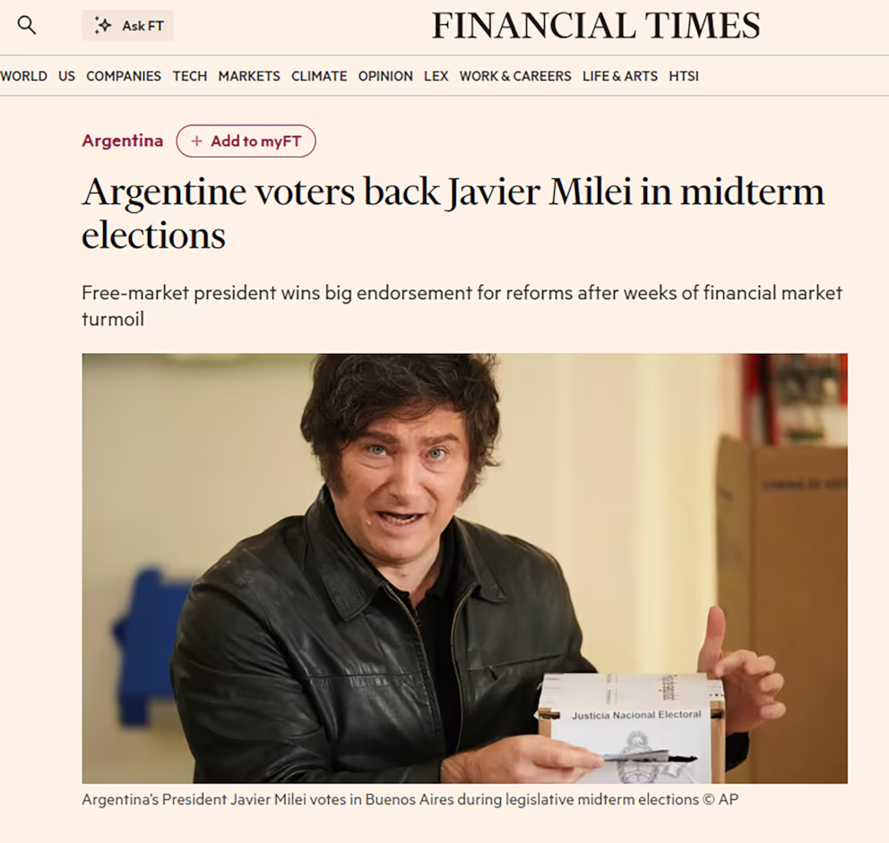 Financial Times publicó “El argentino Javier Milei obtiene una gran victoria en las elecciones legislativas”, focalizando en cómo el triunfo otorga nuevo impulso al paquete de reformas económico-financieras y las reacciones que podría despertar en mercados globales.