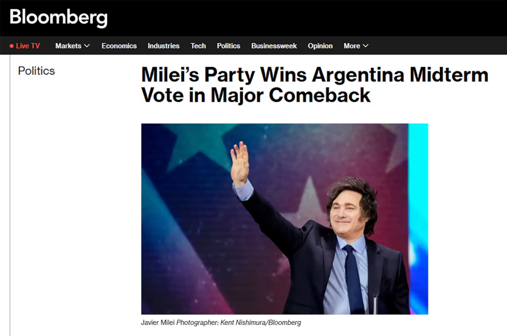 Bloomberg, con la nota“El partido de Milei gana las elecciones de intermedias en Argentina con una remontada importante”, analizó el efecto del crecimiento del oficialismo frente a las expectativas adversas y la importancia estratégica de recuperar terreno en la provincia de Buenos Aires.