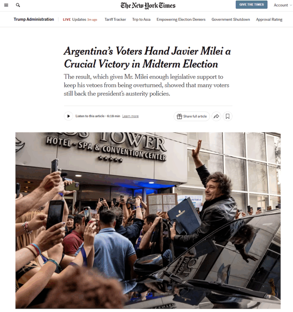 The New York Times tituló su cobertura: “Los votantes argentinos otorgan a Javier Milei una victoria crucial en las elecciones de mitad de período”. El artículo destacó la victoria de Milei en las legislativas, señalando que el resultado refuerza su posición política y le permite avanzar con su agenda libertaria.
