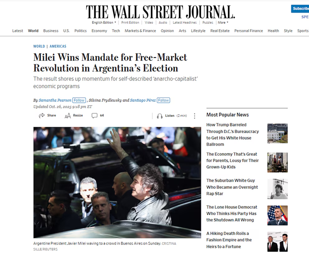 The Wall Street Journal tituló “Milei gana el mandato para la revolución del libre mercado en las elecciones argentinas”. En su cobertura, el diario estadounidense resaltó que la victoria fortalece la propuesta liberal del mandatario y describe que el respaldo obtenido envía una señal clara al mundo de que su proyecto político continúa vigente.
