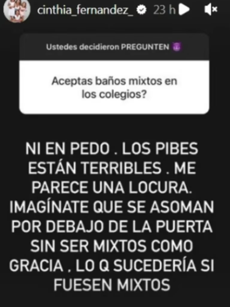 Ya es conocido que a Cinthia le afecta la realidad, y se ocupa de decirlo por sus redes sociales. En una ocasión cercana también se refirió al tema de los baños públicos compartidos para hombres y mujeres. Su respuesta fue contundente: “Ni en pedo. Los pibes están terribles. Me parece una locura. Imaginate que se asoman por debajo de la puerta sin ser mixtos como gracia, lo que sucedería si fueran mixtos”, remató la panelista.