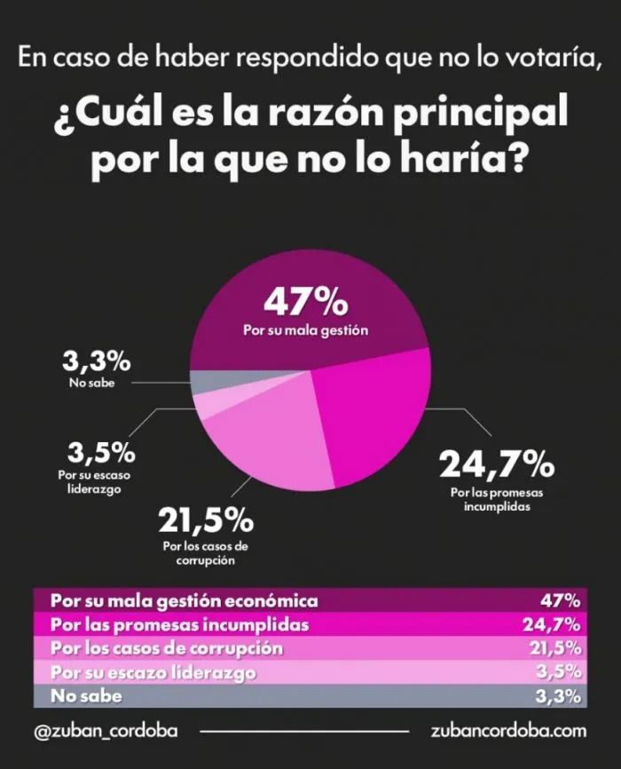 Al indagar en los motivos del rechazo, el estudio señala que la principal causa es la percepción de una mala gestión (47%), seguida por promesas incumplidas (24,7%) y hechos de corrupción, que explican más de un 20% del descontento. Este último punto se consolida como un factor cada vez más relevante en el deterioro de la imagen presidencial.