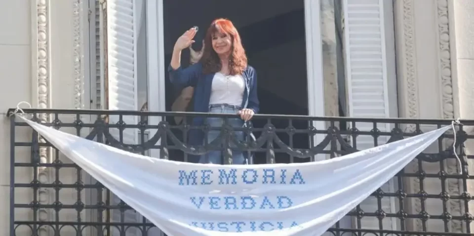 Cristina Kirchner protagonizó el momento más esperado por su militancia al asomarse esta tarde al balcón de su departamento sobre la calle San José. En medio de su condena a seis años de prisión, la ex presidenta saludó a los manifestantes y desplegó un pañuelo blanco con la consigna “Memoria, Verdad y Justicia”. El gesto, repetido en varias ocasiones a medida que avanzaban los grupos, desató el apoyo inmediato de una multitud que se concentró frente al edificio para acompañar su situación bajo la campaña “Cristina Libre”.