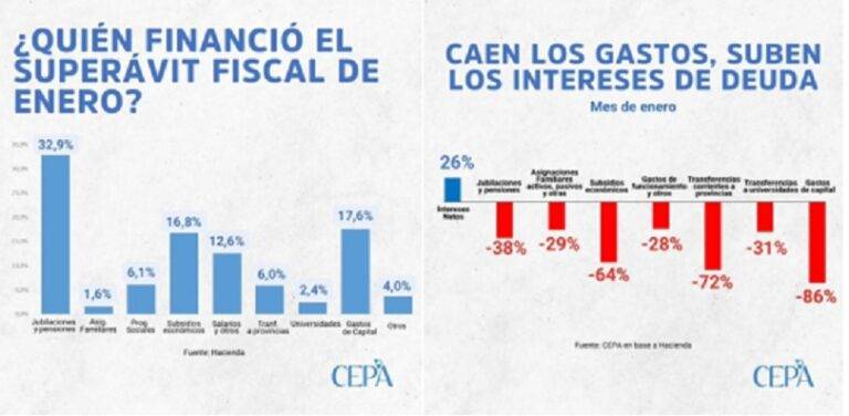 El ajuste fiscal del mes de enero 2024 expone un recorte significativo de amplias partidas del gasto que registran caídas reales en términos interanuales, y a su vez implica que gane peso en términos relativos el pago de intereses de deuda, el cual crece en términos reales. Nuevamente nos enfrentamos al doble impacto del endeudamiento existente, ya no sólo sobre los dólares disponibles para el desarrollo, sino sobre los pesos disponibles para el gasto público. Aquí podemos ver los datos del mes de enero que publicamos desde CEPA: