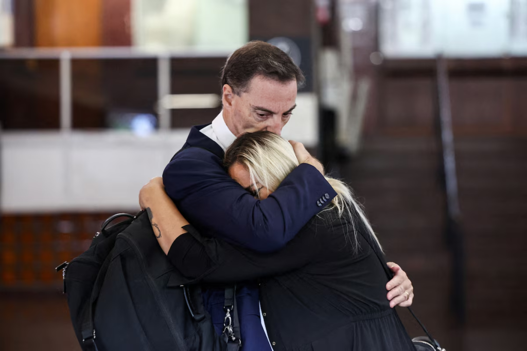 Verónica Ojeda, ex de Maradona, abrazada por Baudry (REUTERS/Agustín Marcarian)
