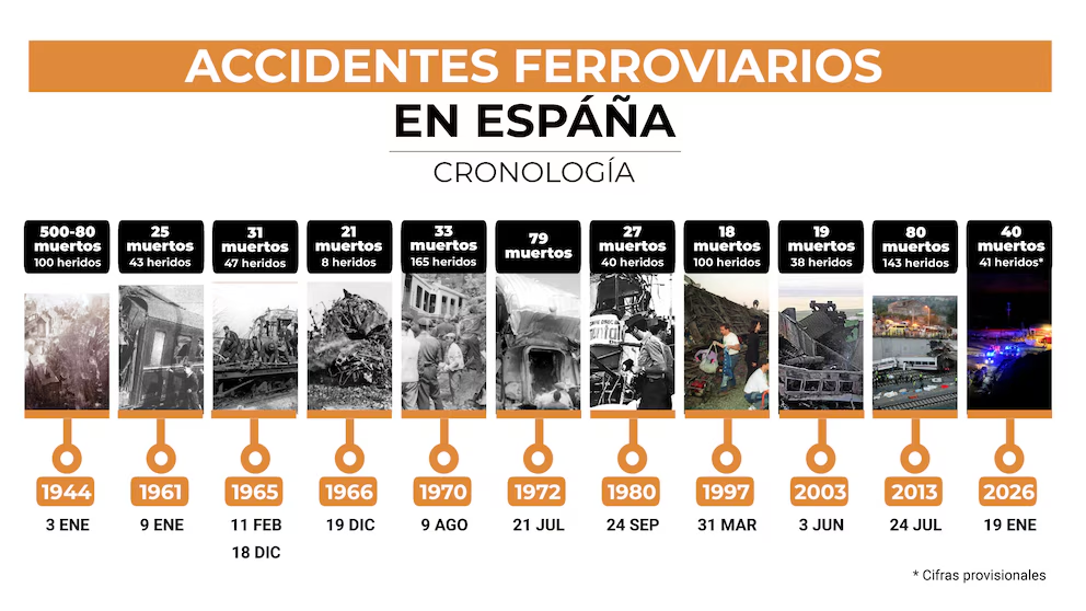 Cronología de los accidentes ferroviarios en España, con motivo del descarrilamiento en Adamuz, en Córdoba. / Infobae