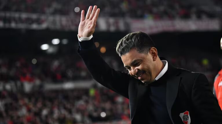 Apenas puso un pie en la cancha, Gallardo sonrió y levantó sus brazos para saludar a los simpatizantes que no paraban de ovacionarlo. Caminó lento, mientras disfrutaba del momento, hacia el banco de suplentes. Todo el Monumental se unió en el ya clásico cantito: “Muñeco, Muñeco, Muñeco”.