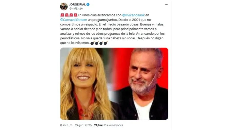 Jorge Rial Viviana Canosa conducirán un programa juntos en Carnaval Stream, y se conocieron algunos detalles.