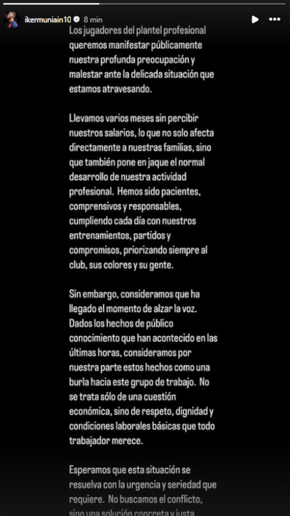 “Los jugadores del plantel profesional queremos manifestar públicamente nuestra profunda preocupación y malestar ante la delicada situación que estamos atravesando”, escribió el ex hombre del Athletic Club de Bilbao. En el descargo, pidió un pronto final para este conflicto: “Esperamos que esta situación se resuelva con la urgencia y seriedad que requiere. No buscamos el conflicto, sino una solución concreta y justa”.