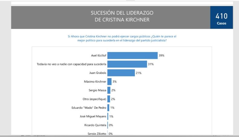 La encuesta se realizó en base a 1.030 casos y sólo a 410 personas se les preguntaron por la sucesión de CFK. El sondeo se llevó a cabo de manera on line de manera geolocalizada.