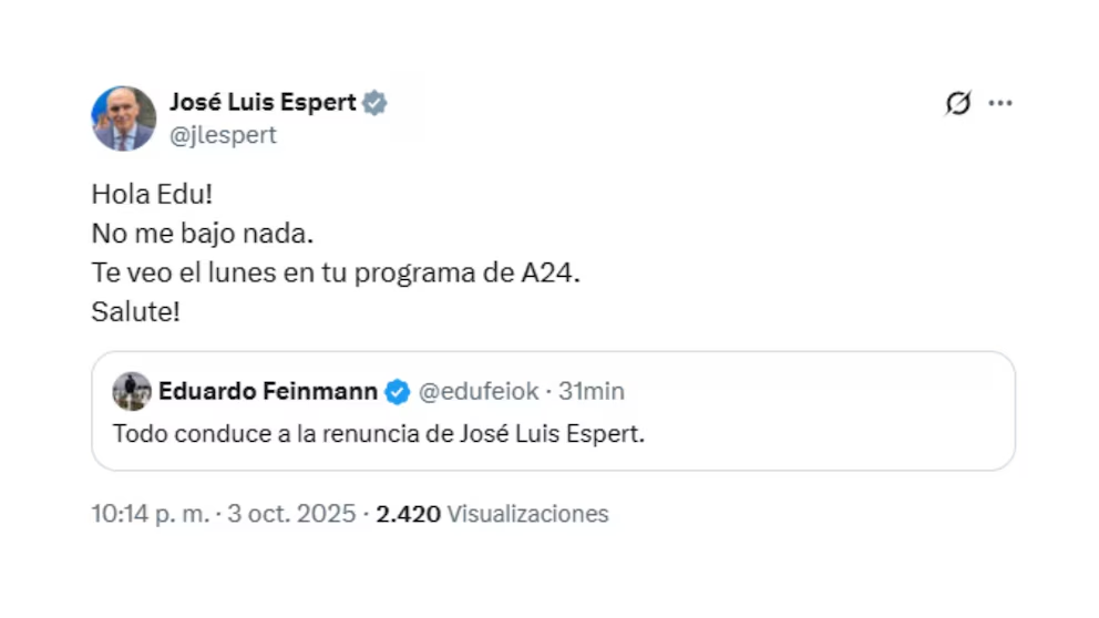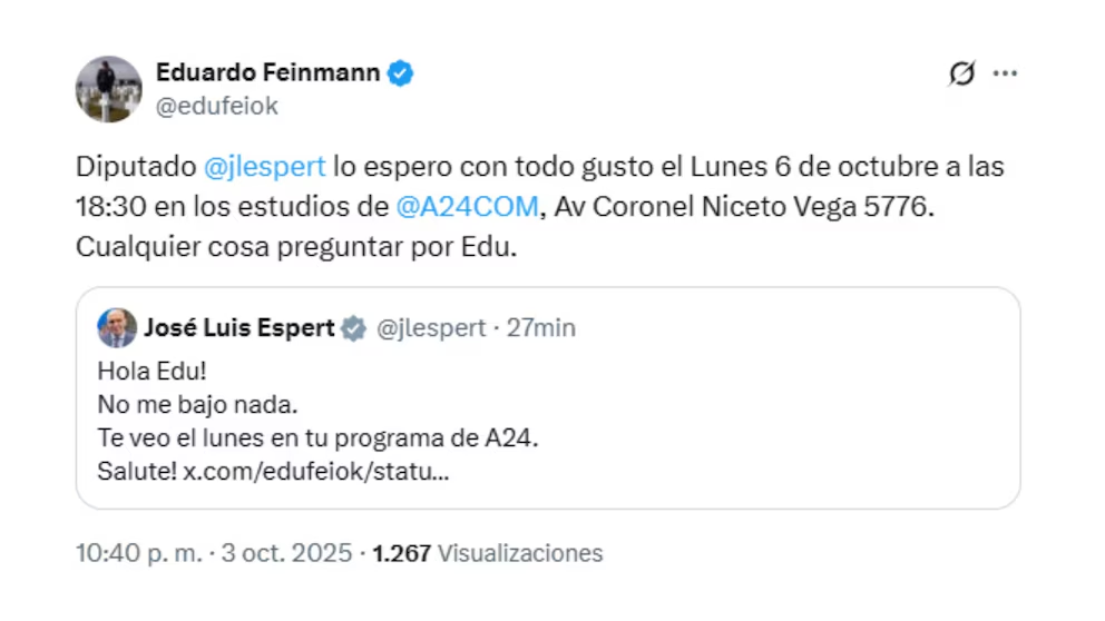 “Todo conduce a la renuncia de José Luis Espert”, había escrito Feinmann. A lo que Espert replicó: “Hola Edu! No me bajo nada. Te veo el lunes en tu programa de A24. Salute!”.