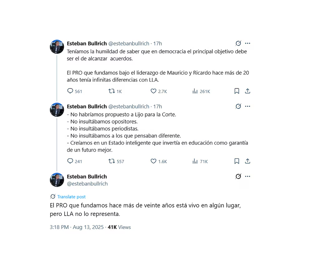 En el contexto del debate interno, la figura de Esteban Bullrich toma relevancia por el peso simbólico que representa su legado dentro del PRO y por la referencia a una época de consensos y diálogo transversal. Su crítica, aunque personal, aparece en sintonía con las discusiones abiertas en sectores tradicionales del partido respecto al rumbo adoptado desde la firma del acuerdo con La Libertad Avanza.