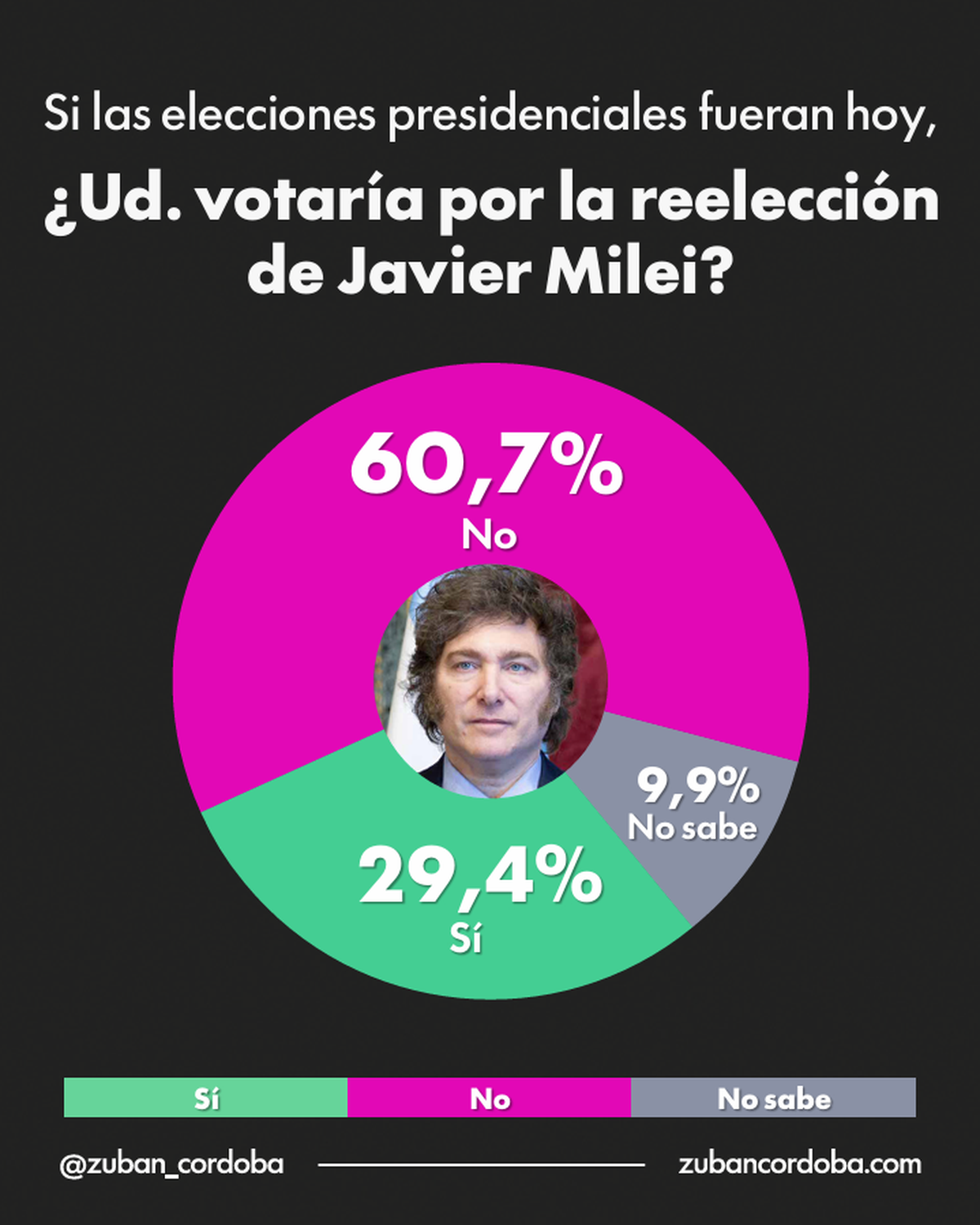El sondeo expone que el 60% de los consultados afirma que no votaría por la reelección del Presidente, y sólo un 29,4% sí lo haría, lo que volvería la base de sustentación presidencial a niveles de la PASO y las elecciones generales de 2023.