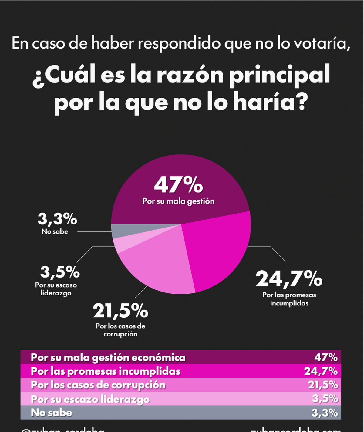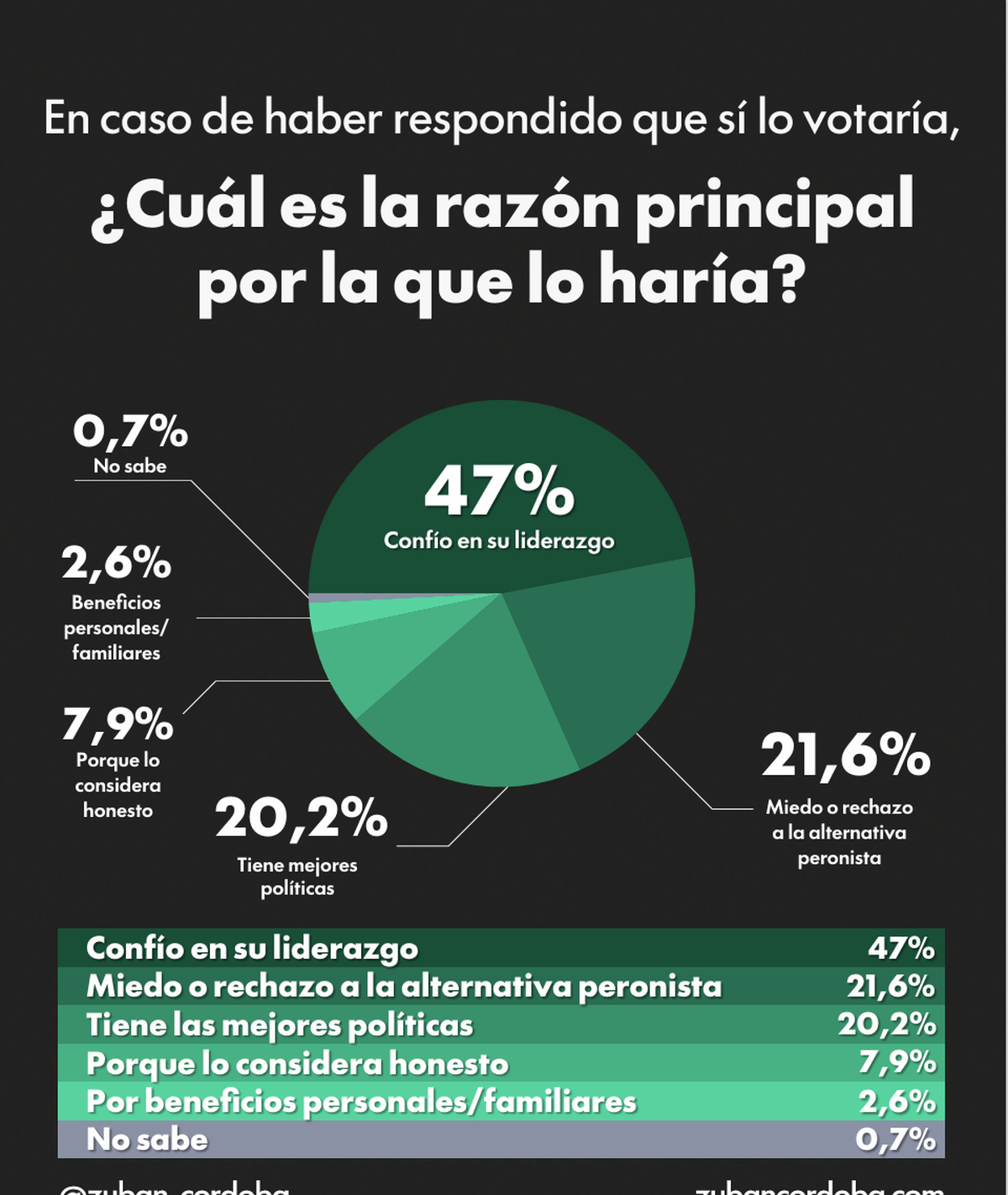 Al examinar los detalles de la encuesta, se encuentra que entre quienes optan por votar la reelección del Presidente (29,4), cerca del 70% lo hace por elementos políticos: la confianza en su liderazgo (47%) y el rechazo a la “alternativa peronista” (21,6).