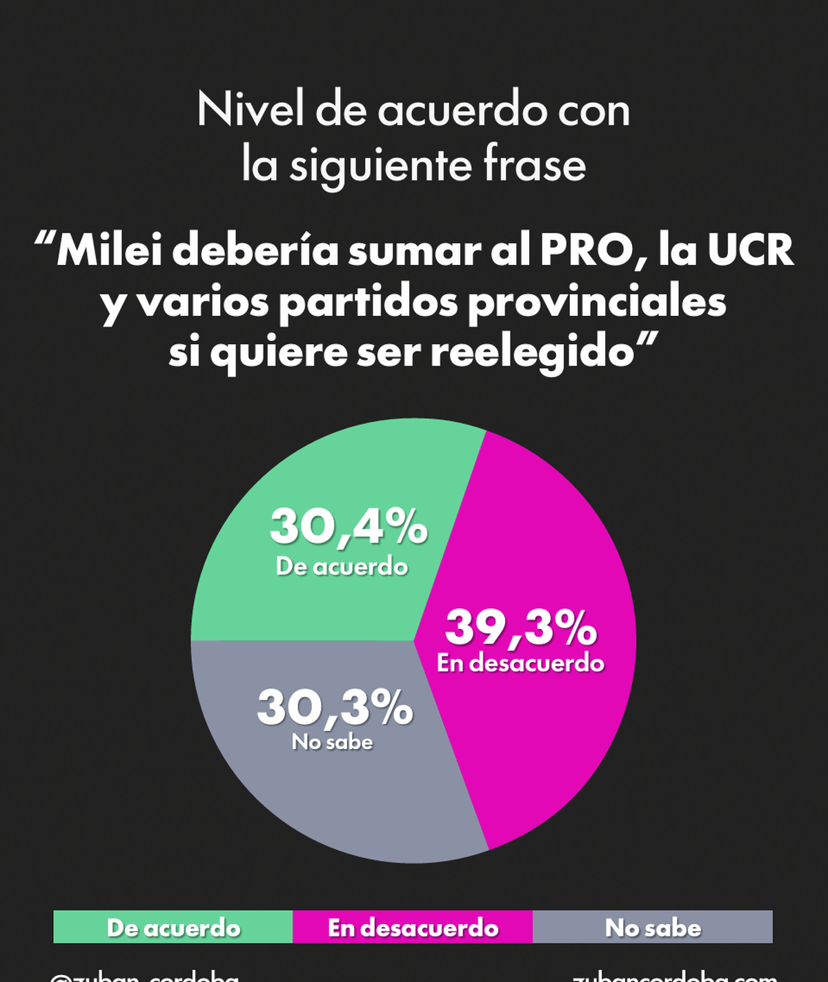 En este sentido, la encuesta de abril de Zuban-Córdoba muestra que sólo un 30% de los consultados está de acuerdo con que LLA sume a la UCR y el PRO en un frente que busque la reelección del Presidente.
