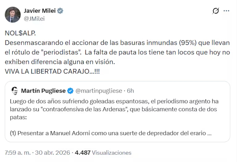 “Desenmascarando el accionar de las basuras inmundas (95%) que llevan el rótulo de ‘periodistas’. La falta de pauta los tiene tan locos que hoy no exhiben diferencia alguna en visión”, escribió el jefe de Estado en su cuenta de X.