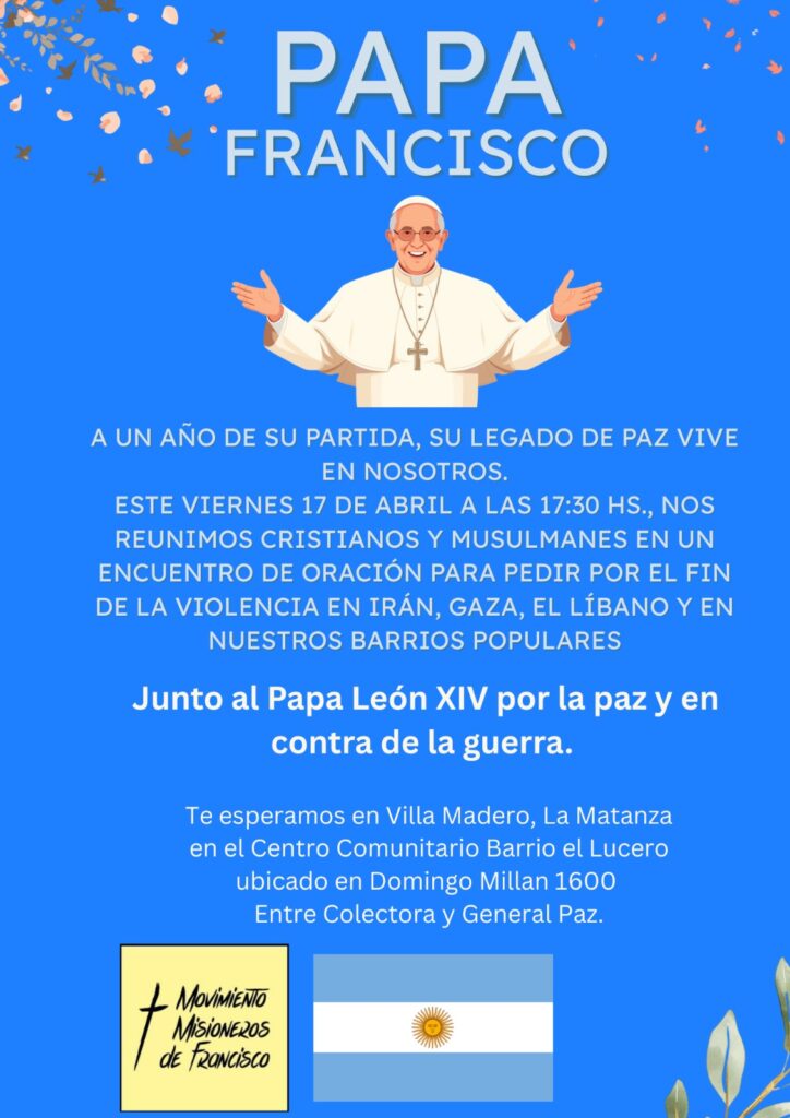 Entre las múltiples conmemoraciones celebradas a un año de la partida física del PAPA FRANCISCO, se llevó a cabo en Villa Madero una muy única en toda Argentina, dónde en un barrio popular Cristianos e Islamicos se unieron una vez más para honrar el legado del Papá Argentino “FRATELLI TUTTI ,HERMANOS TODOS” el encuentro conto con la Presencia de Madres que perdieron sus hijos por el narcotráfico, jóvenes en recuperación que dieron testimonio de la ruina que son las drogas. Organizado por Los Misioneros de Francisco estuvieron presentes en el centro comunitario del Barrio 2 de Abril de Villa Madero Partido de la Matanza, El Padre Juan Bosco Cura párroco de la Capilla Nuestra Señora de Luján de La localidad de Villa Celina ,perteneciente al Obispado de San Justo que conduce Monseñor Eduardo García, EL Sheij Masmud Aid presidente de la Organización Islamica de La República Argentina y director de la Mezquita el Mártir de la Provincia de Tucumán, El Sheij Abdul Karim Paz Director de la Mezquita Atauhid del Barrio de Floresta,