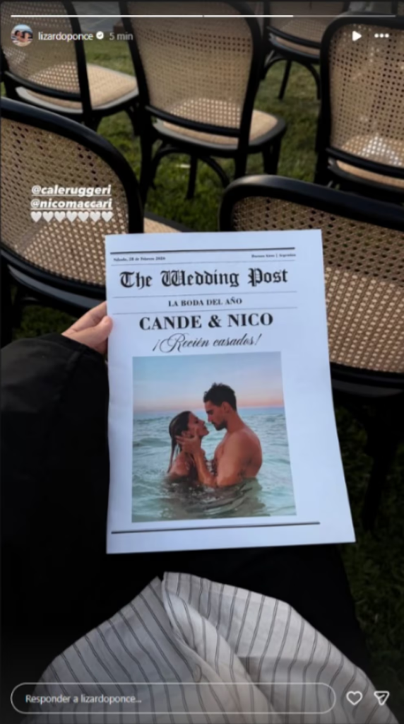 Entre los momentos más destacados, los invitados recibieron un ejemplar de “The Wedding Post”, un diario especialmente diseñado para la ocasión, con la foto de los recién casados y la frase “La boda del año. Cande & Nico. ¡Recién casados!”. Justamente, quien mostró este detalle fue Lizardo Ponce, quien se encontraba disfrutando de la ceremonia junto a Sofía Jujuy. El evento incluyó un emotivo paseo de la pareja por el pasillo central, con la novia saludando con el ramo en alto, entre aplausos y lágrimas de emoción de los presentes.