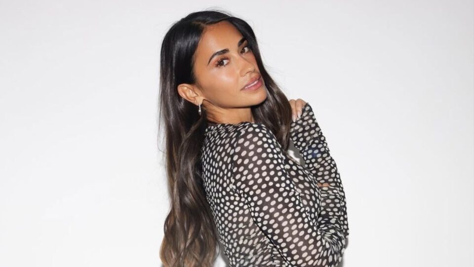 Se trata de un conjunto luminoso y minimalista que refleja su estilo personal. El mismo está compuesto por un top blanco de escote halter y un pantalón denim tiro alto en tono claro. Una propuesta simple y veraniega que encaja con el clima de Miami y con el tono relajado del evento. En la imagen, Antonela Roccuzo posa sonriente frente a una gran torta de crema decorada con flores y velas doradas.