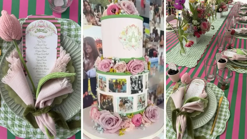 Además, Antonela Roccuzzo mostró el pastel principal decorado con fotografías impresas que recorren distintos momentos de su vida, formando una especie de collage alrededor del segundo piso del diseño. La decoración vuelve a incluir flores en tonos rosados, que rodean la base y la parte superior. Allí aparece una letra “A”, que hace referencia a su nombre. Los tonos rosa pastel y verde se repiten en la torta, acompañando así el estilo elegante de la fiesta.
