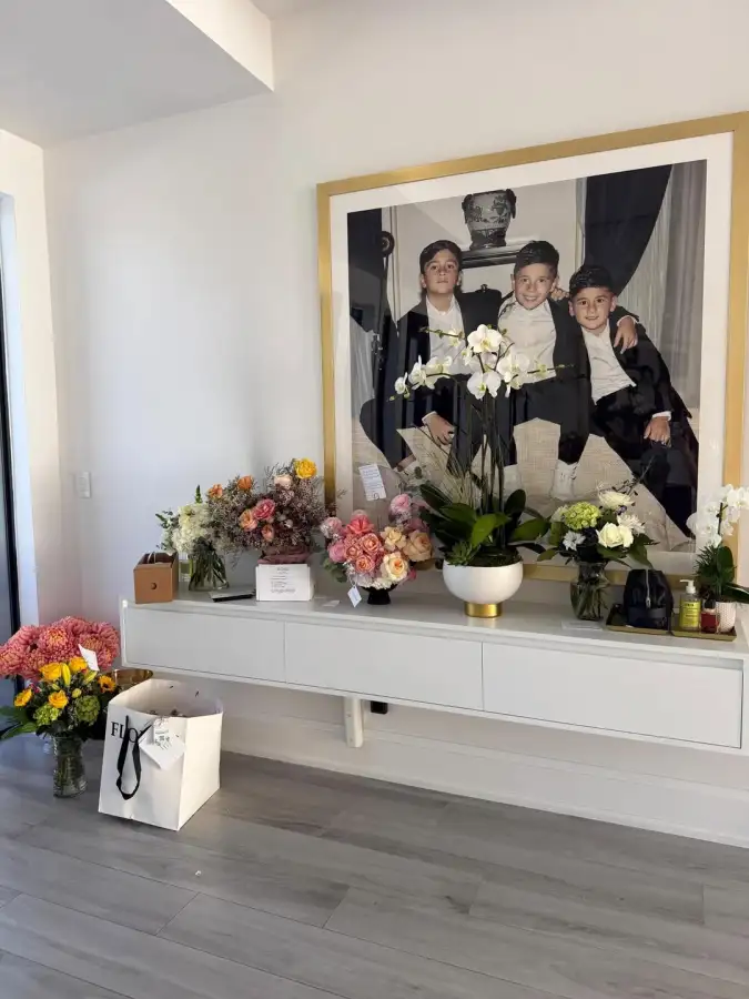 Su estilismo se completó con un maquillaje natural y un cabello suelto con ondas suaves. En la siguiente fotografía, Antonela Roccuzzo mostró que la entrada de su residencia se encontraba ambientada con arreglos florales en tonos blanco, amarillo y rosa pastel. Lo que más cautivó a los usuarios de Instagram fue el enorme y tierno cuadro de sus tres hijos, fruto de su amor con Lionel Messi. Los pequeños posan sonrientes luciendo trajes formales, un recuerdo que la rosarina no dudó en enmarcar y colocar en el sitio principal de su casa.