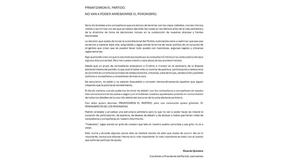 Por medio del texto emitido por “Federales: un grito de Corazón”, Quintela acusó a la facción representada por la expresidenta Cristina Fernández de Kirchner de haber influido en el proceso electoral para evitar que pudiera desarrollarse la interna. “Desde que un grupo de compañeros empujaron a Cristina a irrumpir en el escenario de la disputa electoral interna del partido, lo que podría haber sido un camino de apertura, participación y democracia se convirtió en un tortuoso proceso de obstaculización, chicanas, caza de brujas, persecución y aprietes políticos a compañeros y compañeras de todo el país”, denunció.