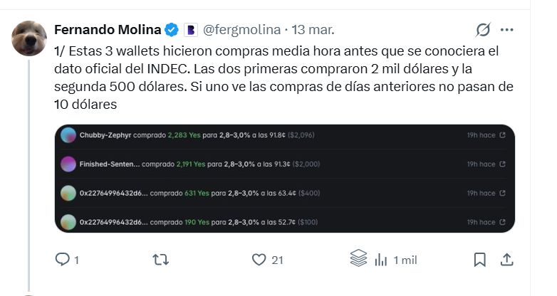 El experto digital Fernando Molina analizó el flujo de las transacciones y expuso el comportamiento de los ganadores. “Hubo al menos 3 cuentas que compraron 30 minutos antes de que se supiera el dato por montos muy por arriba del promedio operado”, explicó. La trazabilidad permitió identificar perfiles específicos: una cuenta inyectó USD 2.000 tras probar previamente el rango inferior; una segunda, también con USD 2.000, ostenta un 100% de efectividad apostando a la inflación desde enero; y una tercera introdujo USD 500 justo antes de la publicación. Una cuarta billetera, que se hizo viral por llevarse una ganancia de USD 663, venía realizando operaciones menores durante la semana.