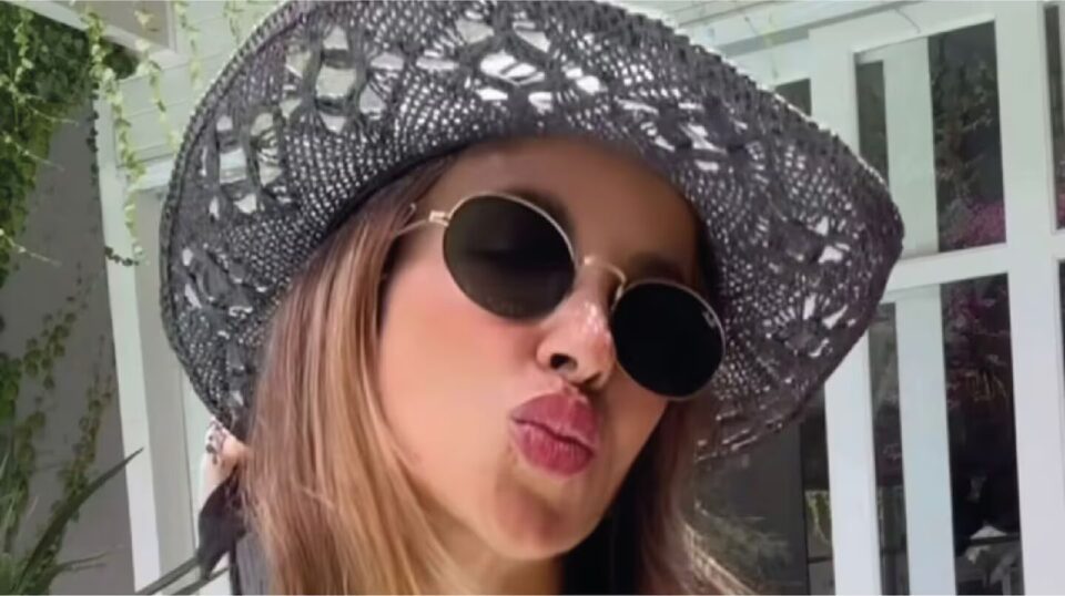 Elevó el estilismo de pileta con un sombrero cowboy en color negro con un pañuelo anudado y lentes de sol ovalados con vidrio negro y marco métalico dorado.