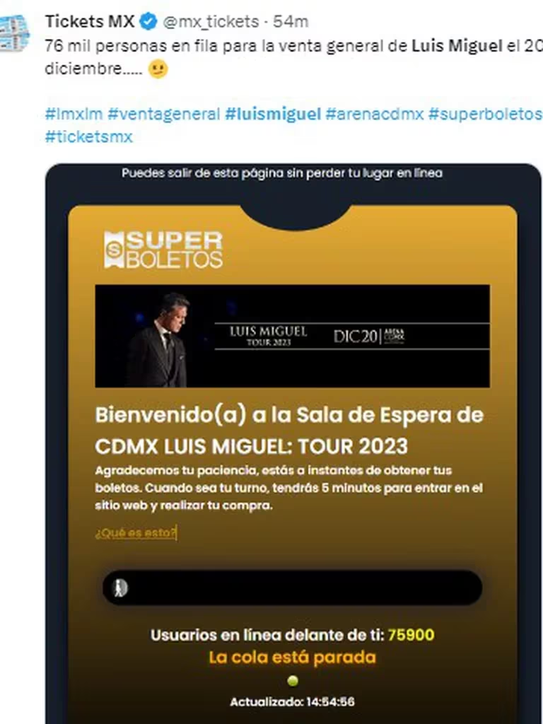 La alegría que causó la nueva fecha, se tornó frustración para fans de ‘El Sol’, quienes a través de X se quejaron por no alcanzar boletos. De acuerdo publicaciones en X, hasta 70 mil personas llegaron a estar conectadas simultáneamente haciendo fila virtual de SuperBoletos, y pese a permanecer por horas, muchos no pudieron comprar sus entradas.