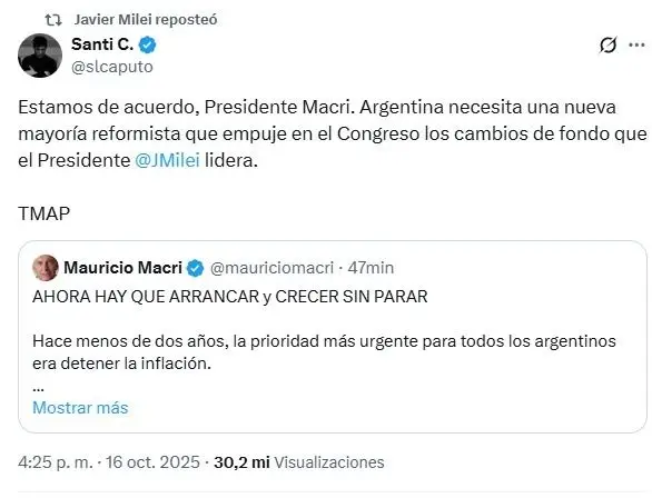 El mensaje del ex mandatario tuvo su repercusión. La cuenta del asesor presidencial Santiago Caputo retuiteó el mensaje y le agregó: “Estamos de acuerdo, Presidente Macri. Argentina necesita una nueva mayoría reformista que empuje en el Congreso los cambios de fondo que el Presidente Milei lidera. TMAP”. Este texto fue replicado por el propio Jefe de Estado.