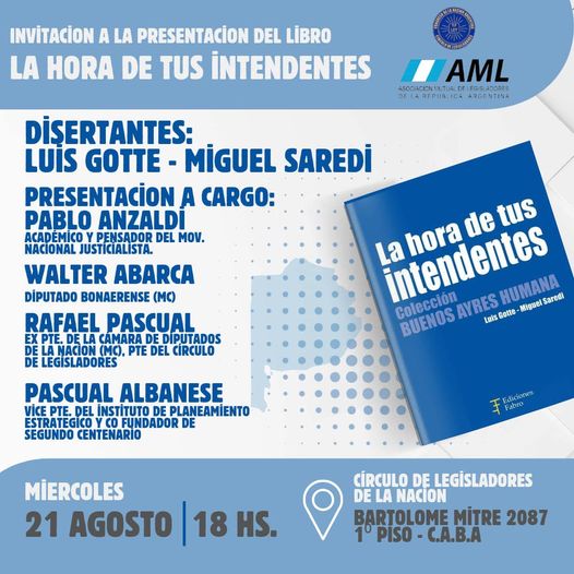El Secretario de Planificación Operativa de La Matanza disertará en la presentación de “La Hora de tus Intendentes” el miércoles 21 de agosto a las 18:00hs, en el Círculo de Legisladores de la Nación, Bartolomé Mitre 2087, 1° piso, Ciudad Autónoma del Buen Ayre (CABA)