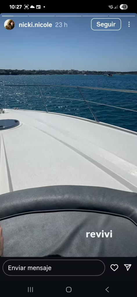 Lejos de esconder su escapada ibérica, Nicki Nicole dejó en su cuenta de Instagram algunas postales de sus días en Ibiza: el yate, el horizonte, la puesta del sol y algunas selfies. Además, contó que se mareó, que vomitó y que luego logró recuperarse. Por último, subió una historia en la que apenas se le ve una parte de la cara y se la escucha cantar el famoso bolero “Bésame mucho”, todo un gesto de amor. “Ella cantaba la versión que quería, viste”, escribió sobre las imágenes.