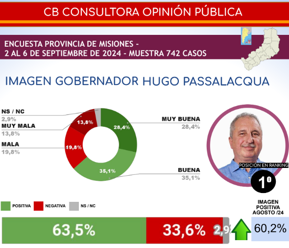 Según el último informe de CB Consultora, Passalacqua se mantiene firme en la primera posición entre los gobernadores con mejor imagen positiva. El mandatario ostenta un 63,5% de aprobación. La eficiencia en la metodología, con cercanía es una de las claves de su alta valoración. Se lo ve entre la gente, no solo gobernando para ella, lo que ha consolidado su figura como un líder cercano. La calidez con la que es recibido, es la muestra clara de la conexión que ha logrado forjar con los misioneros de a pie.