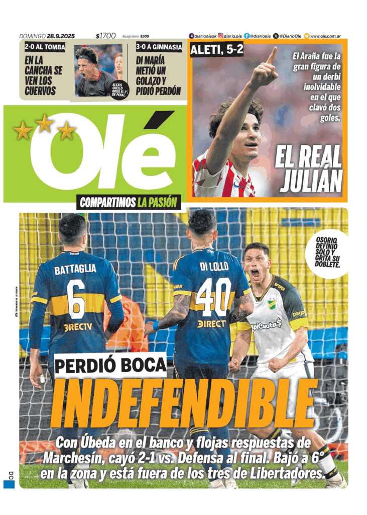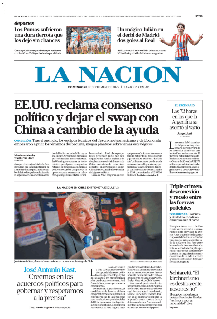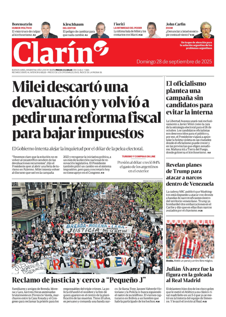 Tapas de los principales diarios nacionales de este domingo 28 de septiembre 28 septiembre, 2025 La Nación Clarín Página 12 Olé Crónica Perfil