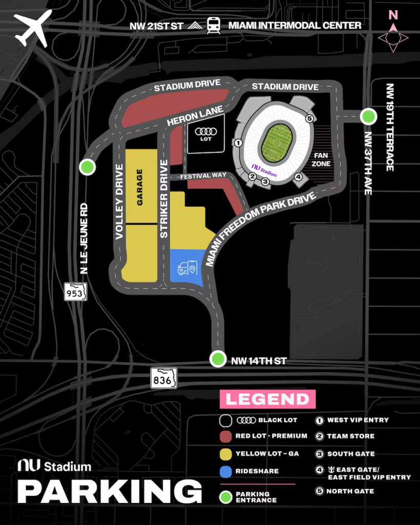 El estadio, situado junto al Aeropuerto Internacional de Miami, cuenta con un diseño innovador para mejorar la experiencia de los aficionados. Las gradas contarán con una cobertura meteorológica y las diferentes tribunas incluyen asientos a pie de campo, palcos, clubes y suites, además de contar con espacios Premium para magnificar la jornada.