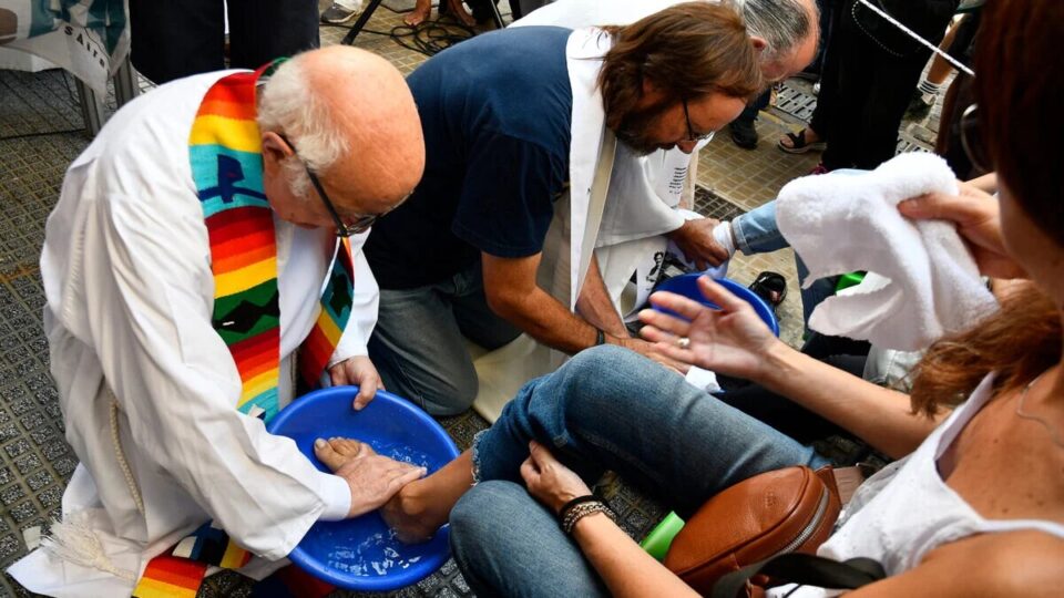 Lágrimas en los rostros o el llanto contenido en la garganta. Así vivieron los trabajadores y religiosos el pasado Jueves Santo, por la tarde, en el acampe frente al ingreso a la Agencia Telam de la calle Bolívar al 500, en el microcentro porteño. Las lágrimas brotaron en quienes recibían el lavado de sus pies y también de los religiosos que se inclinaron a lavarlos imitando el gesto de Jesús en la Última Cena.