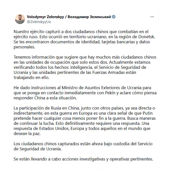 “Tenemos los documentos de estos prisioneros, tarjetas bancarias y datos personales”, añadió Zelensky en una publicación que incluía un vídeo de uno de los presuntos prisioneros chinos.