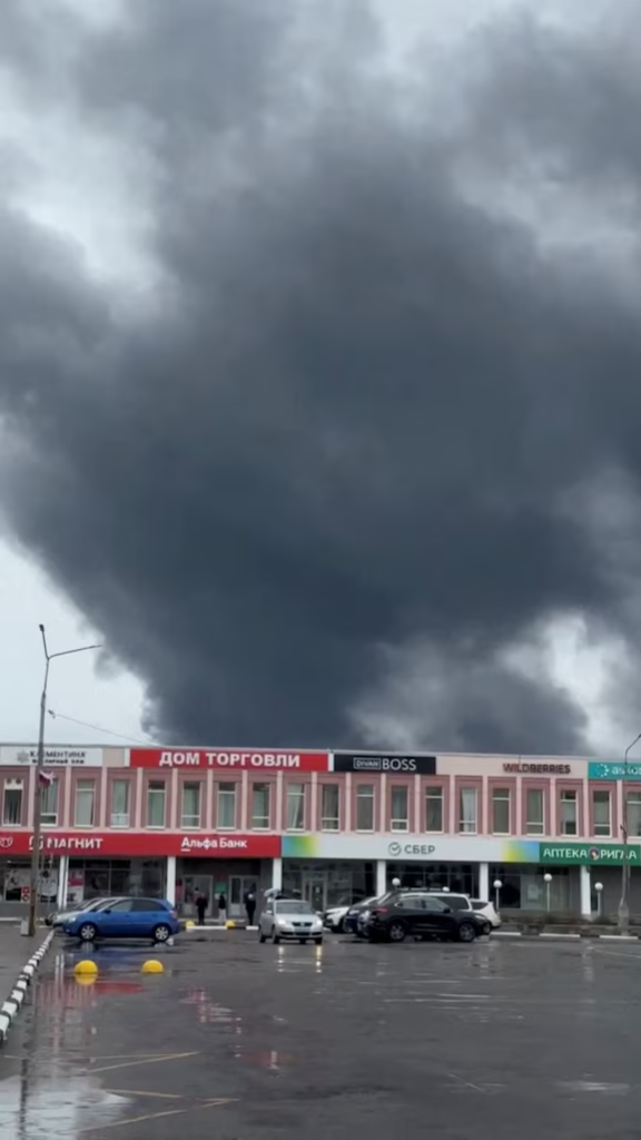 El humo se eleva tras el ataque con drones ucranianos,en Olenegorsk, en la región de Murmansk, Rusia (Social Media via REUTERS)